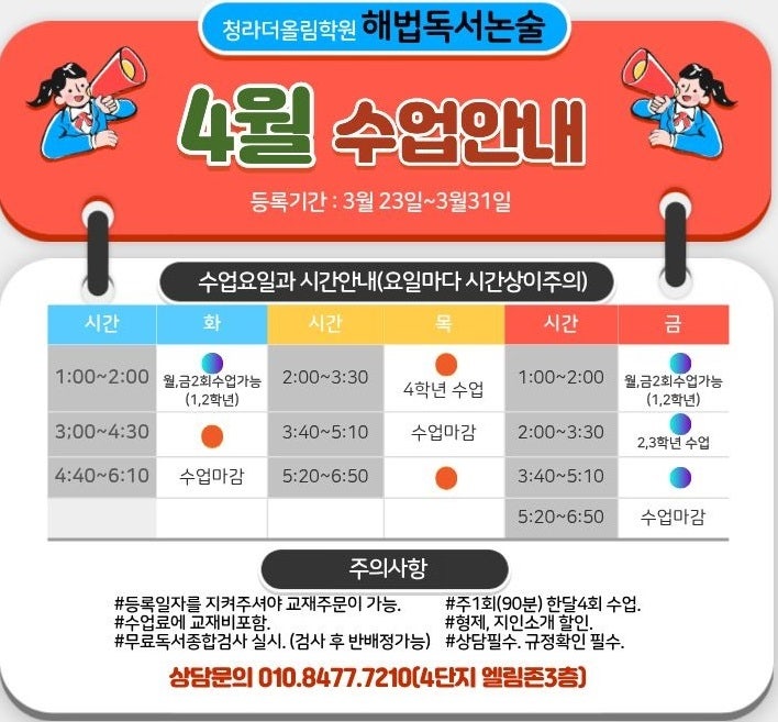 안녕하세요~ 청라더올림 안원장입니다.^^ 4월 해법독서논술 시간표가 나왔습니다!!!! 수업가능, 또는 수업 이라고 쓰여 있는 시간에 등록이 가능합니다. 독서논술 시작하고 2달째입니다^^ 도서, 시사등을 읽고 자기의 생각을 표현하는 우리 아이들의 모습을 보면서 논술 시작하기를 잘했구나~~ 하는 생각을 합니다. 문해력은 기본! 논술은 필수!! 망설이지 마시고~ 상담부터 받아보세요~~ 무료독서종합검사 받아보시고 결정하셔도 됩니다!!! 감사합니다^^ 상담문의 : 010 8477 7210 #청라독서#청라더올림#청라국어#청라독서논술#청라엘림존#청라4단지논술#청라4단지초등수학#청라초등수학#청라초등국어#청라한글#청라더올림학원#청라안원장#청라....... <img src="https://blogthumb.pstatic.net/MjAyNjAzMjFfMTkx/MDAxNzc0MDU5MDQ4NDg4.0bzfG4fbsl1IJoeBNJQoKviHAoWn0Q9iu4WJO3Gr4Agg.5tB8kGXj0dVwON9UaIuAPwnSH3eKIXkmwY_vqhGL_AQg.JPEG/4%BF%F9_%BC%F6%BE%F7%BE%C8%B3%BB.jpg?type=s3" />