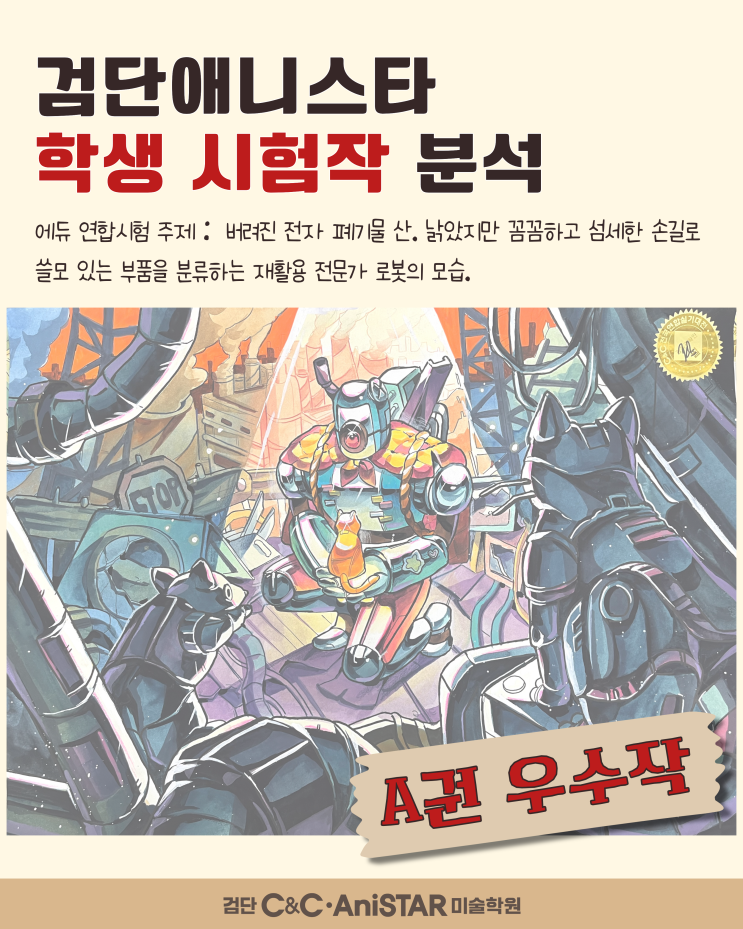 안녕하세요~~ 인천서구 검단C&C미술학원 애니관 애니스타입니다! 오늘은 검단애니스타 학생 시험작 분석 을 보여드리고자 합니다. 검단애니스타 학생 시험작 분석 A권 우수작 에듀 연합시험 주제: 버려진 전자 폐기물 산. 낡았지만 꼼꼼하고 섬세한 손길로 쓸모 있는 부품을 분류하는 재활용 전문가 로봇의 모습입니다. 배경 Part 포인트 컬러가 되는 주황색을 하늘에도 배치하면서 그림의 전체적인 분위기를 잡을 수 있도록 합니다. 주제부 Part 무대형 구도를 활용하여 스포트라이트 효과를 이용해 가운데 배치한 주제부에 시선이 집중될 수 있도록 합니다. Tip. 주제에 맞춰 주제부를 디자인 하기! 초근경 Part 근경을 눌러 거리감을....... <img src="https://blogthumb.pstatic.net/MjAyNjAzMjZfMTg4/MDAxNzc0NTI5MjIyNDQy.EXFYsPuUSTglIsgnVw13cnimBMYt1mizzzrJjNspRNYg.jGC-ZGO3yExaZoW4BTRFvg6qL7T7Lw9mMtgTNKDSU_Qg.PNG/a%B1%C7%BA%D0%BC%AE_%281%29.png?type=s3" />