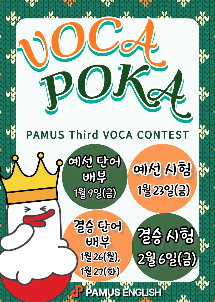 안녕하세요 학부모님 파머스영어 검암캠퍼스입니다. 겨울방학과 함께 제3회 보카포카 콘테스트가 돌아왔습니다 학생들의 영어 실력 향상과 학습 동기 부여를 위해 진행되고 있는 보카포카 콘테스트는 단순한 시험을 넘어 영어의 기초를 탄탄하게 다지는 시간으로 자리 잡고 있습니다. VOCA POCA 일정 안내 예선 단어 배부 : 1월 9일(금) 예선 시험 : 1월 23일(금) 결승 단어 배부 : 1월 26일(월), 27일(화) 결승 시험 : 2월 6일(금) 영어 공부에서 ‘단어’가 중요한 이유 영어 학습에서 단어는 집을 지탱하는 기초 공사와도 같습니다. 아무리 문법을 잘 알아도, 단어를 모르면 문장을 이해하거나 표현하기 어렵기 때문입니다. ✔ 단어....... <img src="https://blogthumb.pstatic.net/MjAyNjAxMDhfMjEx/MDAxNzY3ODUwODMwMTkw.K3QazYP5sn92WnfTV-ZaLKrWjkEmZMR5aKunDN75sgQg.FQq9iXTgIz3pK9PMYTIGa7e1VCk8wgNO4ax0rCjzqZIg.PNG/image.png?type=s3" />
