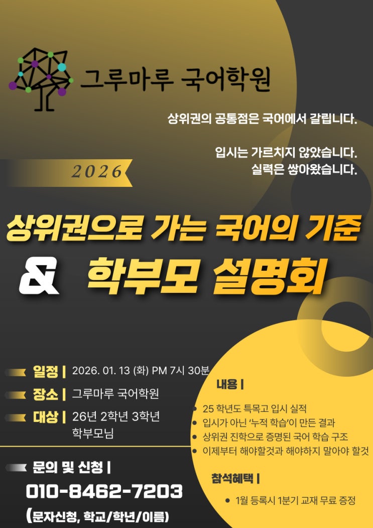 새해가 밝았습니다. 라고 하기엔 버얼써 일주일이 지났네요 ^^ 그루마루가 인사드립니다. 새해 복 많이 받으시고, 올해도 모든 학부모님들 건강하시고 행복하시길 기원합니다- 이제 이번주면 거의 모든 학교들이 졸업 및 종업식이 진행되지요 (짝짝짝 한해도 수고하셨습니다) 방학이 시작되면서, 이 학원 저학원 스케줄 변동도 많으시고 특강도 있고 해서 정신이없으셨을꺼라 사료됩니다. 이제 어느정도 정돈이 되셨을 것이라 생각이 되어, 꼭 말씀드리고 싶었던 설명회를 개최하고자 인사드렸습니다. *저희가 입시를 따로 하지는 않았으나, 겨울방학때 특목면접특강을 진행하고- 꾸준히 아이들과 상담하고, 마지막에 고민하며 자소서를 쓰는데 도....... <img src="https://blogthumb.pstatic.net/MjAyNjAxMDhfNzUg/MDAxNzY3ODQ5NzQwNjI5.0X1qt6MnReJ13C10ViI2DoFs_HguP3Pne0MA9HsuQwog.QeCEPTLH4EiCPiaJ2pdiBtMhpxLRyqtUZV2mhjGUvOgg.JPEG/26%B3%E2_%BC%B3%B8%ED%C8%B8_%C0%A5%BF%EB.jpg?type=s3" />