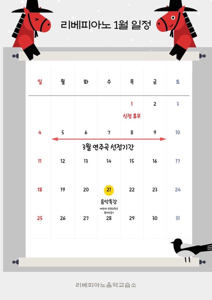 안녕하세요. 리베피아노음악교습소입니다 2026년 1월 학원 주요 일정을 안내드립니다. 1월 1일 (목) – 신정 휴무 1월 1일은 신정 공휴일로 학원 휴무입니다. 해당일에는 모든 수업이 진행되지 않으며, 보강은 별도로 진행되지 않습니다. 1월 5일(월) ~ 10일(토) 3월 연주곡 선정 기간 3월 정기 연주회를 위한 연주곡을 이 기간 동안 순차적으로 선정합니다. 학생의 현재 수준과 성향을 고려하여 원장님과 함께 곡을 정하고, 개인별 맞춤으로 안내드릴 예정입니다. 1월 21일 (수) – 음악 특강 베토벤 운명 교향곡 주제곡 음악 특강이 진행됩니다. 아이들이 클래식 음악을 보다 친숙하게 느끼고, 연주에 필요한 음악적 이해....... <img src="https://blogthumb.pstatic.net/MjAyNjAxMTBfMjAy/MDAxNzY4MDM1MDQyNzE3.84nVDC2CkRahrkZcBLheN1fUBvULAVT3Yj_yEybeLYEg.8DEsC-a0D-PLwOuseAC1cT90Nh-vEm2tOU2nAkbU-F8g.JPEG/KakaoTalk_20251231_181922752.jpg?type=s3" />