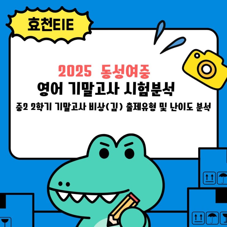 2025 동성여중 중2 2학기 영어 기말고사 시험 분석 중학교 영어, 이제는 ‘감’이 아니라 ‘분석’으로 대비해야 합니다 중학교 2학년 2학기 영어 기말고사는 단순 암기보다는 유형 이해 + 문법 구조 파악 + 서술형 대응력을 얼마나 갖췄는지가 그대로 드러난 시험이었습니다. 이번 동성여중 2학년 영어 기말고사 시험지를 분석해 보면, 많은 중학생들이 어려워하는 포인트가 명확하게 보입니다. ✔ 시험 출제 범위 및 구조 분석 총 26문항 구성 객관식 80점 + 서술형 20점 객관식 비중이 높지만, 서술형 4문항이 등급을 가르는 핵심 중2 영어 시험에서는 객관식 실수 최소화 + 서술형 안정적 확보가 매우 중요합니다. ✔ 문제 유형별 출제....... <img src="https://blogthumb.pstatic.net/MjAyNTEyMjlfMjYy/MDAxNzY2OTg3NzYxNjIy.Y5zz84AUAGS5F44yO9IbsBONdqbkhvVLrx12L03myfIg.vhayges1zsmZHVolzeHUuiU_5a9zM60zPuedQO049nEg.JPEG/1.jpg?type=s3" />