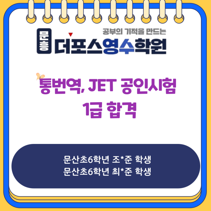 ♥※※※3회 체험수업 진행 중 안녕하세요! 아이들이 영어를 '공부'가 아닌 '언어'로 즐기며 성장하는 곳, 문흥 더 포스 초등영어를 소개합니다. 오늘은 저희 원의 기특한 6학년 친구들이 전해온 눈부신 소식을 공유하려고 합니다. 단순히 "영어를 잘한다"를 넘어, 공인 시험을 통해 그 실력을 당당히 증명해냈는데요! ● 오늘의 주인공들이 일궈낸 성과 ● JET(Junior English Test) 1급 합격 ITT(Interpretation & Translation Test) 통번역 자격시험 1급 합격 ※ 초등학생이 '통번역 1급'? 어느 정도 실력인가요? 많은 학부모님께서 "초등학생이 어떻게 벌써 통번역 시험을 봐요?" 혹....... <img src="https://blogthumb.pstatic.net/MjAyNjA0MDZfODgg/MDAxNzc1NDQyNTM2NTM3.igJQTJP7AgXegFR0OuW1vYmQrEP0uaCWRJKJplJpwogg.2JeXVg49M71hZyQNGA9RRj4gwp2bO26blZd74VDhO20g.PNG/tq-001.png?type=s3" />