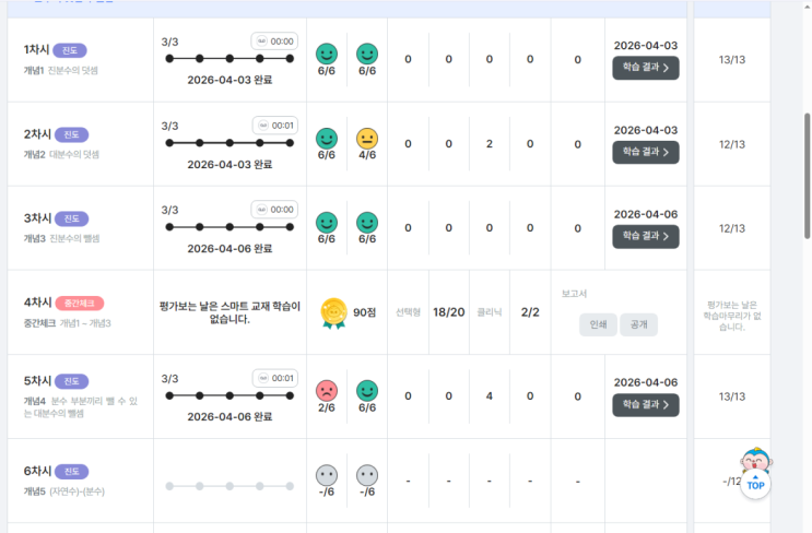 차근차근 성실하게 공부하고 있습니다. 학생의 성취도도 바로바로 확인할 수 있고, 어떤 문제에서 어떤 답을 써서 틀렸는지도 확인할 수 있습니다. 오늘 공부 중에 6문제 중 2개만 맞아 이모티콘이 빨갛게 표시되었길래 “○○아, 얘 운다~ 울어~”라고 했더니 “아~~ 계산 실수가 너무 많았어요. 그래도 다시 고쳐서 다 맞았어요!”라고 말하네요. 진도표를 보면서 빨간 이모티콘이 나오면 너무 속상해하지 말라고, 이렇게 가볍게 웃으며 이야기해 주는 타이밍입니다. <img src="https://blogthumb.pstatic.net/MjAyNjA0MDZfMjU1/MDAxNzc1NDY4OTM2ODgy.Yc6OOD8Yezlpp-99cFiUbA1F4BBD_EOjibPnnJTrpjAg.aUf2xDM-L8I5V-HMFiBbkQAgXnLwCczEGZqTaIRzQrUg.PNG/image.png?type=s3" />