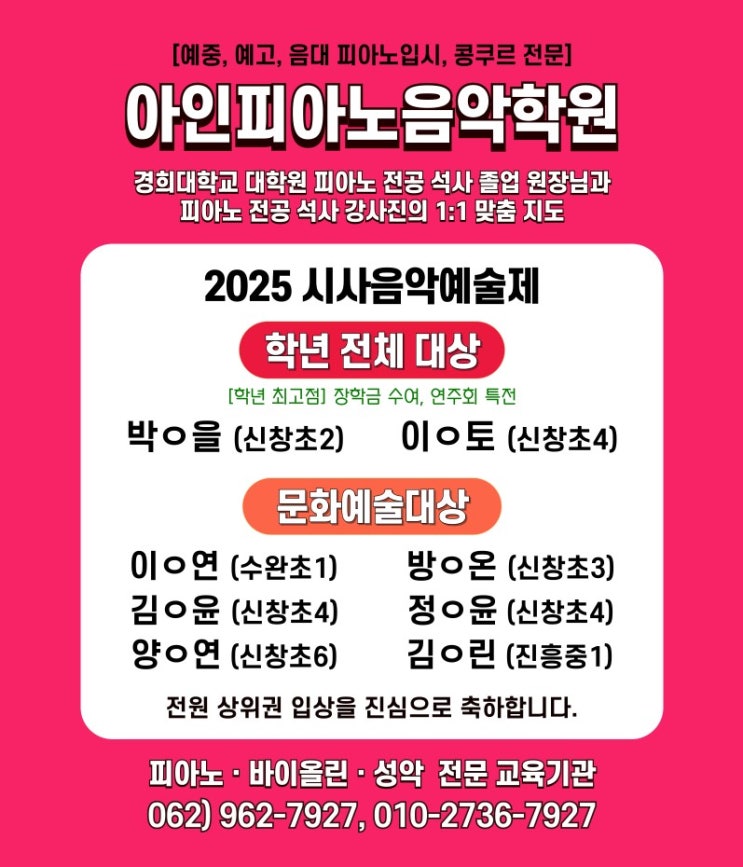 #한국영재음악예술제 #저학년대상 #학년전체대상 #광주피아노대회 #신창동아인피아노 "아인피아노음악학원" • 경희대 음악학과 피아노전공 석사 졸업 원장님과 • 피아노 전공 석사 강사진이 지도합니다. ⏰️수업 시간 ⏰️ • 오후 2시-7시까지 ⏰️중·고등부⏰️ • 중·고등부 특별반(저녁반): ~8시까지 **저녁반 수업은 중고등부만 가능합니다.** ( x 유치부, 초등부 x) ⏰️성인취미반⏰️ 평일 오전, 저녁, 주말반 중 선택. ❤ 제13회 전국서석예술제 링크 ❤ ❤아인피아노만의 특별한 수업 피드백❤ ❤ 학부모님들의 소중한 후기 ❤ ❤️첫 수업 안내❤️ ❤ 학년 전체 대상(1등) ✨️ 학년 최고점, 장학금 수여, 연주....... <img src="https://blogthumb.pstatic.net/MjAyNTEyMjJfMTAy/MDAxNzY2MzcwMjYyOTE5.D6O9jSr40xoSMT2ydn0TdGNvi6U-XKi05oLDQoxcoqQg.2xaMnvyc2sS4V6a2vyzqtPmIBLjK3pXpv9kMns5P37Qg.JPEG/1766370239198.jpg?type=s3" />