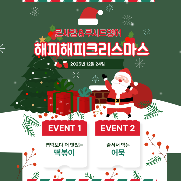 안녕하세요 월곡동영어학원 큰사람운남학원이에요 :) 얼마전 큰사람학원에서는 크리스마스이브날 분식파티를 했어요 공부도하고 맛있는 떡볶이와 어묵탕을 먹는 날이였는데 큰사람 친구들이 너무 좋아했답니다 월곡동영어학원 큰사람운남학원& 루시드영어 해피해피 크리스마스 ! EVENT1 엽떡보다 더 맛있는 떡볶이 EVENT2 줄서서 먹는 어묵 월곡동영수학원 큰사람운남학원 선생님들께서 일찍부터 나오셔서 준비를 열심히 하였답니다 :) 열심히 육수를 우려내고 있는 중이에요~ 밖에서 파는 거랑 별다를게 없어요 엽떡보다 맛있는 떡볶이도 맛있게 만들어지는 중 ! 오랜시간 공들여서 간도 보고 맛있게 만들었답니다 ~ 매운거 못 먹는 친구들....... <img src="https://blogthumb.pstatic.net/MjAyNTEyMzFfNzkg/MDAxNzY3MTc4MDg4MjQx.ATJmNHkpMU0PuCj2sEOOdGEgCZE9kPIIzXWSq6oqmdkg.V-eLxkO7_i8BYql7QE_MVd5JpVFQZLxMtgh_OVjJ4rwg.PNG/%3F%A0%9C%EB%AA%A9%EC%9D%84_%3F%9E%85%3F%A0%A5%3F%95%B4%EC%A3%BC%EC%84%B8%3F%9A%94._%281%29.png?type=s3" />