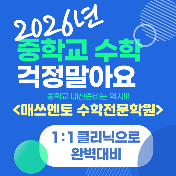 안녕하세요? 매쓰멘토수학전문학원입니다.~~~ "아이가 초등학교 다닐 때 단원평가도 잘 보고 공부방 다닐 때 이해도 잘 했는데 중학교 수학을 너무 어려워해서 걱정입니다." 예비중1 학부모님께서 가장 많이 하는 고민입니다. 잘하는 줄 알았는데... 자꾸 어렵다고 해요...자신감이 없어져서 큰일이에요... 도대체 중학교 수학, 왜 갑자기 어려워질까요? 초등 수학과 달리 중학교 수학은 개념이 깊어지고 문제 유형이 다양해집니다. 그래서 단순히 ‘틀린 문제를 다시 풀어보는 것’만으로는 부족하죠. 매쓰멘토수학전문학원에서는 다릅니다! <핵심 시스템> - 매쓰멘토수학학원 수업시스템 - 1. 매일 5문항 테스트 2. 교재학습 3....... <img src="https://blogthumb.pstatic.net/MjAyNjAxMDZfMjM0/MDAxNzY3Njk5MTkxNDcy.AshZZWj48-NRqfXzF7C8bys8i0n6zsanrmWNpRiCVFkg.T_j-tuaUcmrPqsdZinfe3wyQbXdHMvDv9kUShxKy-Scg.PNG/2026%B3%E2_%C3%CA%B5%EE6%C7%D0%B3%E2_%B8%F0%C1%FD_%282%29.png?type=s3" />