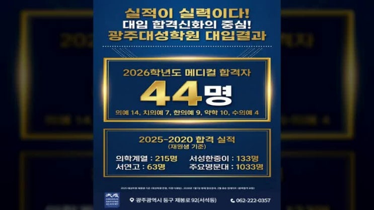 광주독학재수학원 입시 명가 광주대성에서는 다시 한번 대학 입시를 준비하는 우리 수험생들을 위해 독학재수반을 운영하고 있는데, 이번 포스트에서는 이런 광주대성학원의 독학재수반과 함께하며 가천대, 전남대 의예과에 합격한 학생의 후기를 통해 어떻게 대학입시를 준비해서 합격할 수 있었는지에 대해서 소개 드리도록 할게요...^^ 광주독학재수학원 명가 광주대성 가천대 전남대 의예 합격생 후기 안녕하세요^^ 저는 2월부터 광주대성학원 독학재수반을 다니면서 수능을 준비하여 가천대 의예과, 전남대 의예과에 합격한 김**입니다. 제가 학원에서 어떻게 공부했는지 그리고 과목별로 어떻게 학습했는지에 대해 소개하고자 합니다. 저는....... <img src="https://phinf.pstatic.net/image.nmv/blog_2026_03_31_115/LtDhOlL5fC_01.jpg?type=f480x480" />