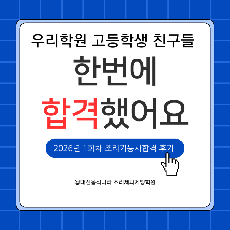 대전한식조리기능사 준비 중이신가요? 2026 1회차 한식조리기능사실기는 “시간 부족으로 제출 못 했다”는 후기가 많았습니다. 그런데 대전음식나라조리제과제빵학원 고등학생 친구들은 단 한 번에 최종합격했습니다. 오늘은 학원 입장에서 **합격 이유(실기 시간관리/루틴/피드백)**와 중·고등학생 때 자격증을 따두면 좋은 점까지 정리합니다. 대전한식조리기능사 2026 1회차|고등학생 ‘단번 합격’ 기록 올해 첫 시험인 한식조리기능사실기(2026 1회차)는 체감 난이도가 높았습니다. 특히 손이 많이 가는 공정 + 동선 꼬임 + 제한시간 압박 때문에 실제로 “시간이 모자라 제출을 못 했다”는 얘기가 많았죠. 그럼에도 우리 학원 고등학생....... <img src="https://blogthumb.pstatic.net/MjAyNjAyMDZfMTE3/MDAxNzcwMzY5Mzc2NDY0.PkKKAWXhxL19pbFfp-N0HCPi_tCND_QWXXmzFPexPhIg.BcaV_7OgxLVB0o8ZbSp947j0VPj5f3LF7oXRUrRcMdUg.PNG/%BA%ED%B7%E7_%C8%AD%C0%CC%C6%AE_%BA%ED%B7%A2_%B1%F2%B2%FB%C7%D1_%BD%C9%C7%C3%C7%D1_%C6%AE%B7%BB%B5%E5_%C4%AB%B5%E5%B4%BA%BD%BA.png?type=s3" />