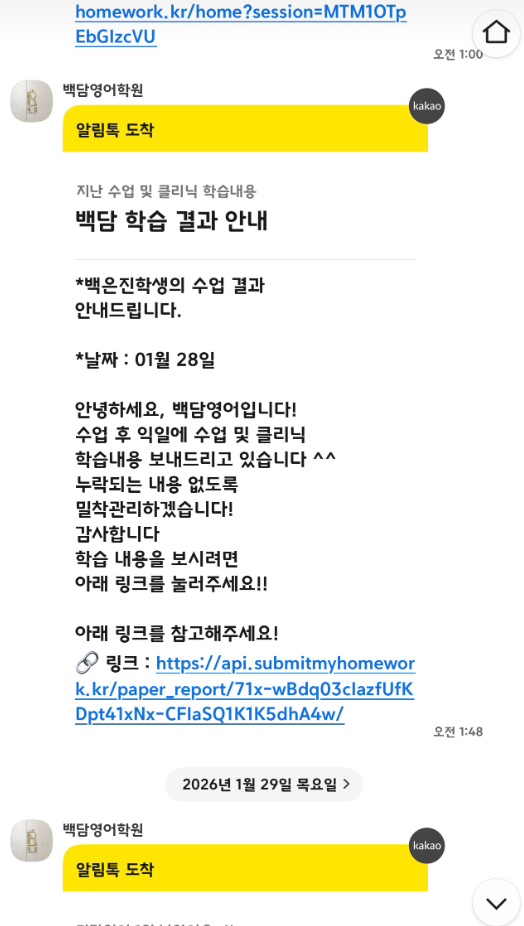 학원 카카오톡 비지니스 채널로 과제 알림과 숙제를 관리 할 수 있는 방법 궁금하신가요? 동탄 백담영어학원 백은진 원장님이 줌 강의를 진행해주십니다! 수강료 3만원, 매달 열림! 2026년 2월 21일 오프라인 세미나로 직접 튜토리얼도 가져보았습니다^^ 오프라인 일정도 나오면 또 공지드릴게요! 세미나에서 다루는 내용들은 알림톡 자동화 테스트지 대량 전송 기능 단어 무한 온라인 학습 구문분석 학습 모의고사/외부지문 변형문제 만들기 분석지 만들기 유의어 예문 단어장 만들기 등 많은 내용들이 다루어지니 궁금하신 분들 줌교육 신청해주세요! <img src="https://blogthumb.pstatic.net/MjAyNjAyMjBfMjgy/MDAxNzcxNTY0ODA0NTIx.Kvj7iSa9U5kzHVZuLVAzK8C_uIADKwj2MX51RoR0QPkg.wdjayrZ2-cnsqxoyCNf10qjmJ5BrDNVsIu-P2poNP2og.PNG/image.png?type=s3" />