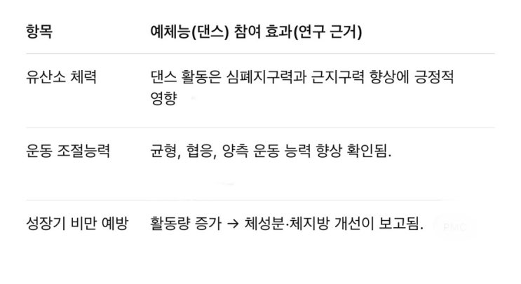1. 개요 – 왜 예체능(춤, 댄스스포츠 등)이 중요한가? 댄스 기반 활동은 단순 신체 활동을 넘어서 ✔ 신체적 건강 ✔ 정서·사회성 발달 ✔ 인지·학습 능력 ✔ 자기표현 및 삶의 질 측면에서 종합적인 교육 효과가 있는 것으로 다수 연구가 제시됨. 2. 신체 발달 효과 (즉각적 & 장기적) 어린 시기 활동량 부족과 비만 위험은 많은 교육 시스템에서 문제로 대두되므로 댄스 활동이 예방적 효과를 제공할 수 있음. 3. 인지·학습 능력 향상 및 교육적 효과 학업 성취도 및 집중력 향상 • 움직임 기반 액티비티는 기억력·시퀀싱 능력 향상에 도움됨.  • 신체 움직임과 뇌 기능의 상관관계는 기억 형성, 문제 해결....... <img src="https://blogthumb.pstatic.net/MjAyNjAyMjNfMjAg/MDAxNzcxODEzOTYxNTIz.X0zEiH78vPl72dbzT5z5nmoc83zgUXa94KfyzkP_ZNAg.WREes4KQw9LcLxegCVeX7ziZfn49_5eujvxdbKUod0Ig.JPEG/IMG_3648.jpg?type=s3" />