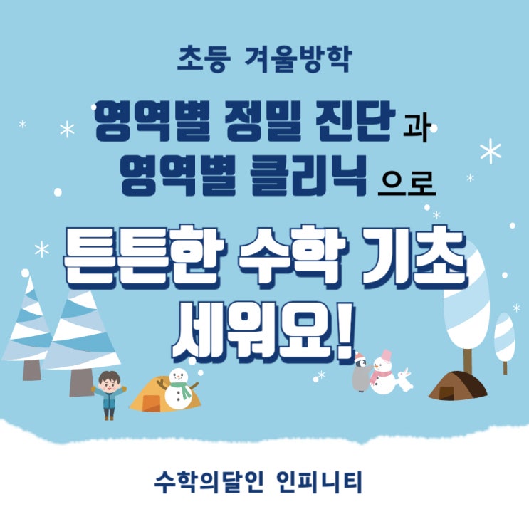 안녕하세요! 우정 초등 수학학원, 수학의달인 인피니티 원장 반려진입니다. 2026년 새해 어떻게 시작하셨나요? 우리 아이들은 방학을 맞아 행복하겠지요:) 겨울방학은 지난 학년의 학습을 완벽하게 마무리하고, 다음 학년 과정을 미리 준비할 수 있는 너무너무 중요한 시기라고 할 수 있습니다. 이 중요한 시기를 우리 아이에게 어떻게 활용해야 할지 고민하는 학부모님들을 위해, 오늘은 수학의달인 '영역별 정밀 진단'의 필요성과 그 결과에 따른 '영역별 클리닉' 활용 사례를 자세히 소개해 드리려고 합니다. 왜 지금, '영역별 정밀 진단'이 필요할까요? 초등 수학은 연산, 도형, 측정, 확률과 통계 등 다양한....... <img src="https://blogthumb.pstatic.net/MjAyNjAxMTVfNjQg/MDAxNzY4NDU5MTQ0ODY4.wUgEu3jQbxxM-mKfXiTtJquF58-0ONnXxfQBOQIZKaYg.65bZuvOMuL9g0S2p0vjWD7B6_yppULU3Wv_7wWtD6NIg.JPEG/%C1%A6%B8%F1%C0%BB_%C0%D4%B7%C2%C7%D8%C1%D6%BC%BC%BF%E4_-001_%2856%29.jpg?type=s3" />