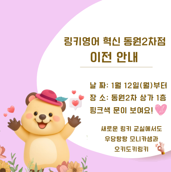 링키영어 혁신 동원2차점 이전 안내 안녕하세요. 더 나은 수업 환경을 위해 다음 주 1월 12일(월)부터 우리 링키 교실이 이전하게 되었습니다. 새로운 장소는 기존과 동일한 동원2차 상가 1층 (바로 옆 동)입니다. 핑크색 문이 눈에 띄어 쉽게 찾으실 수 있어요 항상 믿고 함께해 주셔서 진심으로 감사드립니다. 앞으로도 아이들과 즐겁고 따뜻한 영어 시간으로 보답하겠습니다. 감사합니다 <img src="https://blogthumb.pstatic.net/MjAyNjAxMjBfMTc3/MDAxNzY4OTIwMTI3NTcz.Jy6yDP8yGLjyBTSoWSyq9F3luvqCpFECj7jwkGsDEMEg.JUGp73X74eNUd3r-Rwf4AWBMt6JhY69ZqHP4k-_cx6Ig.PNG/1767947390237.png?type=s3" />