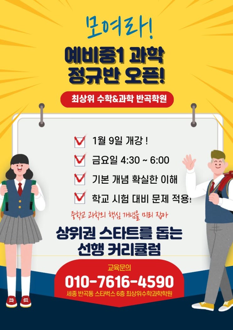 초등 고학년에서 중학교로 넘어가는 시기, 가장 많은 학부모님들이 고민하시는 과목이 바로 과학입니다. 암기 위주의 초등 과학과 달리 중학교 과학은 개념의 깊이와 적용력이 동시에 요구되기 때문에, 준비 없이 시작하면 초반부터 격차가 벌어지기 쉽습니다. 세종 반곡동에 위치한 최상위수학과학반곡학원은 이러한 변화의 시점을 정확히 짚고, 예비중1 학생들을 위한 과학 정규반을 새롭게 오픈했습니다. 단순히 앞서 나가는 선행이 아니라, 중학교 과학의 핵심 개념을 정확히 이해하고 학교 시험까지 자연스럽게 연결될 수 있도록 설계된 과정입니다. 이번 예비중1 과학 정규반은 ✔ 중학교 과학의 핵심 개념을 체계적으로 정리하고 ✔ 개념....... <img src="https://blogthumb.pstatic.net/MjAyNjAxMTBfMjU3/MDAxNzY4MDExNDU0MTIx.KQJnhHEyHF4nS-uH2eX6qO_Kfr-Gq0bqVuiUgLK8Vrog.CM9TAEpIWuwxov9nRL2rT4WaDiS42I-eBeSd3qai-uog.JPEG/KakaoTalk_20260107_133751301.jpg?type=s3" />