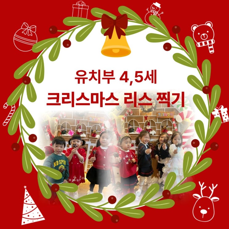 크리에잇펀의 사랑스러운 막내들인 4살,5살의 "크리스마스 리스 찍기" 선생님~ 크리스마스 리스가 뭐에요? 작업 시작 전부터 설렘이 가득한 우리 친구들 오늘은 솔잎으로 물감을 찍어 크리스마스 리스를 만들어보는 날이었어요! 크리스마스 리스를 솔잎으로 물감을 찍어서 표현했어요! 먼저 솔잎을 손에 쥐고 초록 물감을 톡! 톡! 연한 초록, 진한 초록을 번갈아 찍어보며 “이건 숲 색이야!” “이건 트리 색!” 하면서 아이들만의 색 이야기가 술술 나옵니다. 다양한 초록색을 야무지게 찍고 리스에 달아줄 종, 지팡이, 진저브레드, 예쁜 장식과 리본까지 달아보고 처음엔 살짝 조심스럽던 손도 한 번, 두 번 찍다 보니 점점 더 야무....... <img src="https://blogthumb.pstatic.net/MjAyNjAxMDJfODcg/MDAxNzY3MzMwOTU0MDM3.2HhJi9FJ9Kg5mikYDirzW_y19f3xFIVeL5llrGNgt1Qg.tg0gx8-9wKZOaBRDdfnVeMbdW2cd3a5hYabRYYyU6oMg.JPEG/%C1%A6%B8%F1%C0%BB_%C0%D4%B7%C2%C7%D8%C1%D6%BC%BC%BF%E4._%2850%29.jpg?type=s3" />