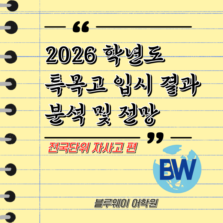 안녕하세요, 분당 정자동 영어학원 블루웨이 학원입니다. 이번 글에서는 지난 번 [경기권 외고/국제고 입시 결과 분석과 전망] 포스팅에 이어 전국단위 모집 자사고의 2026학년도 신입학 입시 결과 분석과 전망으로 찾아왔습니다. 분당 지역의 중학교 3학년 학생들이 주로 지망하는 학교들(용인외대부고, 민사고, 상산고, 북일고 등)을 중심으로 살펴보도록 하겠습니다. 경기권 외고와 국제고들과는 반대로, 전국단위 자사고들의 경쟁률은 큰 폭으로 하락한 경우가 많았습니다. 특히 분당지역에서 부동의 선호도 1위를 자랑하던 용인한국외대부고의 경쟁률이 전년도에 비해서 크게 줄어든 것을 시작으로 북일고도 크게 하락했으며 상산고 또한 남....... <img src="https://blogthumb.pstatic.net/MjAyNjAxMTNfNjEg/MDAxNzY4MjkxODI0Mzg1.fFBiJQnMjLyqjhta6UmidsHs2AjFvmFvvMVdeUtY8B4g.lYg9_J5h84U_wFxxUJsO076cDLeq83CeAkOiv0hkZIYg.PNG/2026%C7%D0%B3%E2%B5%B5_%C6%AF%B8%F1%B0%ED_%C0%D4%BD%C3_%B0%E1%B0%FA_%BA%D0%BC%AE_%B9%D7_%C0%FC%B8%C1.png?type=s3" />