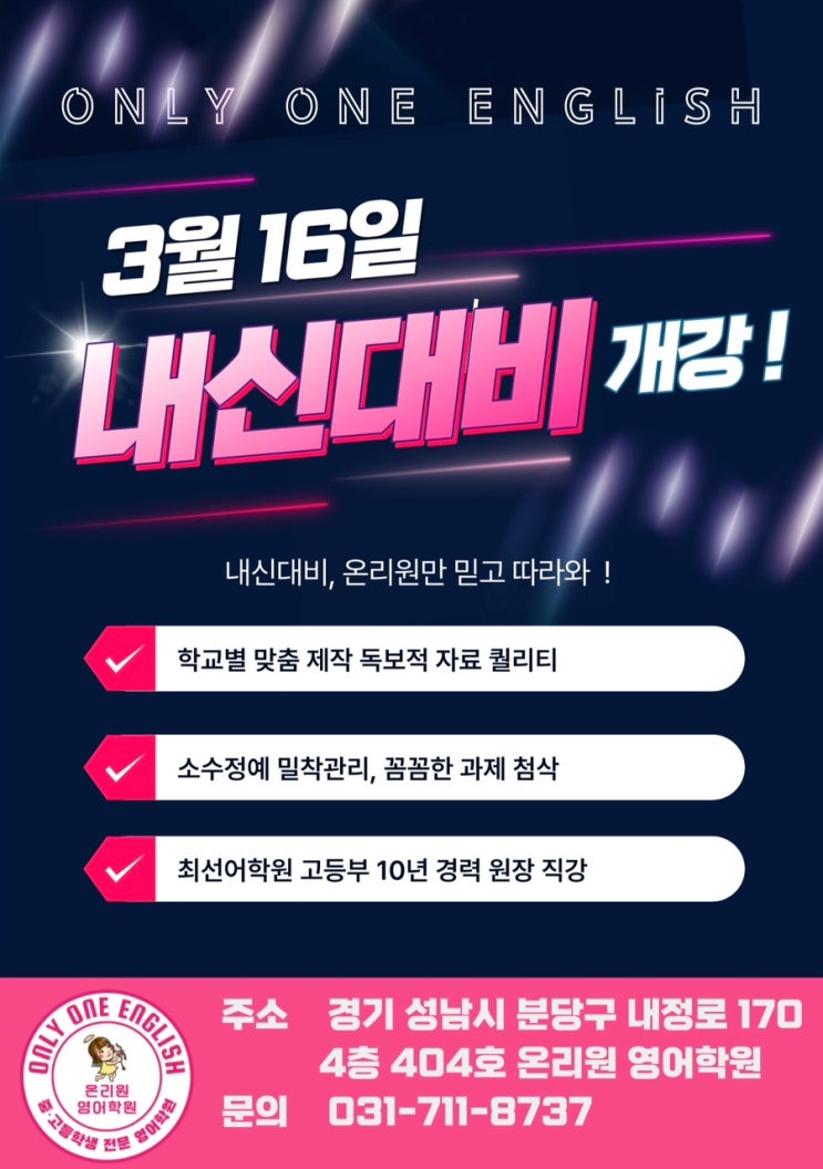 온리원 영어학원 입니다! 개학 3주차, 학원에서는 중간고사 내신대비가 시작되었습니다 학교별 맞춤 제작 자료가 제공됩니다. 교과서 지문 분석과 내용 이해 훈련으로 시작하여 학교 프린트물과 외부 지문 분석, 기출 문제 풀이를 진행합니다. 내신대비는 꼼꼼함이 핵심이기 때문에 학원에서는 정리 노트를 이용하여 중간고사 범위에서 세세한 부분까지 놓지지 않도록 꼼꼼하게 관리하고 있습니다 밀착 오답정리와 권팅쌤의 손필기로 시험 직전까지 ! 올해 첫 시험 온리원과 만점 향해 달려봅시다♀️ <상담 및 문의는 언제든 환영입니다> #분당영어학원 #영어내신 #중간고사 #분당중앙고등학교 #송림고등학교 #서현....... <img src="https://blogthumb.pstatic.net/MjAyNjAzMTlfOTUg/MDAxNzczOTE0NjQ3MTU5.A3LAry3hrt4mIg3TOhoiuDvkRtsiTWS49YO89IXOTfAg.YLQ0kgs88SY-W2tKeYXt4w2uLgVS42QS0j5Jp9XNbNgg.JPEG/IMG%A3%DF8223.jpg?type=s3" />