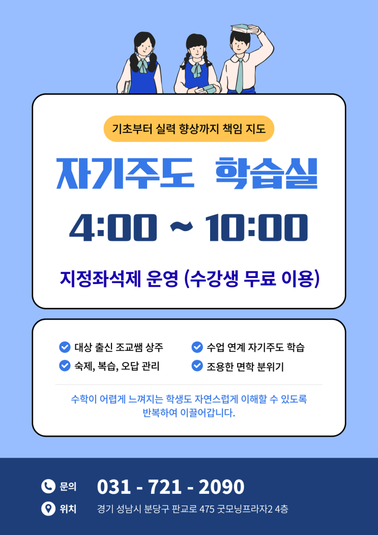 안녕하세요^^ 분당수학 장금이쌤 입니다 요즘 분당 중학생 학부모님들께서 많이 문의하시는 부분 중 하나가 “아이 공부 습관을 어떻게 잡아줘야 할까요?”입니다. 수학 성적은 단순히 수업만 듣는다고 올라가는 것이 아니라 수업 → 복습 → 반복 학습 → 오답 정리 과정이 꾸준히 이루어져야 합니다. 그래서 [ 대상 1% 학원 ]에서는 분당 중학생 수학 공부 습관을 만들어 주기 위해 자기주도 학습실을 운영하고 있습니다. 자기주도 학습실 운영시간 오후 4:00 ~ 밤 10:00 ✔ 전석 지정 좌석제 운영 ✔ 수강생 무료 이용 가능 학생들이 안정적으로 공부할 수 있도록 조용하고 집중하기 좋은 면학 분위기를 유지하고 있습니다. 특히 분당 중학생....... <img src="https://blogthumb.pstatic.net/MjAyNjAzMDVfMTc3/MDAxNzcyNjczODgyMDIy.Vj67odFd6Jip1-uNWV9vx7Kzg2eLmUMR8my8suLZaRsg.FyA2KtsAowMDMyM6VPbBiBS160iueZnZV9M_MGN6aiIg.PNG/KakaoTalk_20260305_102134250.png?type=s3" />