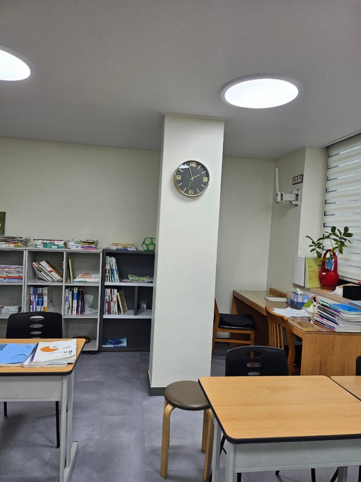 일찍 나와서 학원 청소하고 수업준비 하다가 문득 우리 메인 교실에 있는 시계탑(?) 이라고 부르는 벽을 찍어 봤습니다. 처음 여기 장소 계약하고 인테리어를 앞두고 너무나 큰 고민이 저 기둥이었습니다. 심지어 저런 기둥이 대각선 쪽으로 하나가 더 있었습니다. 직사각형으로 교실이 예쁘게 빠져야 하는데 저 기둥이 너무 거슬렸습니다ㅜ 그런데 인테리어라는게 참 신기하더군요. 인테리어 사장님(리노플랜)이 기둥 하나는 옆에 있는 강의실벽뒤로 매몰 시켰고 이 기둥 하나는 어쩔수 없이 강의실 내부에 둘 수 밖에 없었습니다. 페인트가 칠해지고 바닥 타일이 깔리고 책걸상이 들어 오면서 저 기둥은 지금은 채점쌤 자리와 책상들을 파티션....... <img src="https://blogthumb.pstatic.net/MjAyNjAzMDZfNzYg/MDAxNzcyNzczNDAxMjQ5.F-Bf2o__h2hmYQCYOeQcBJj70Dx-RPLYapWAMfs-AU4g.eH0QXK1bByIQ7YDdcNcf2fDwYhf6zGDQg-b62VN59Qsg.JPEG/900%A3%DF20260306%A3%DF135930.jpg?type=s3" />