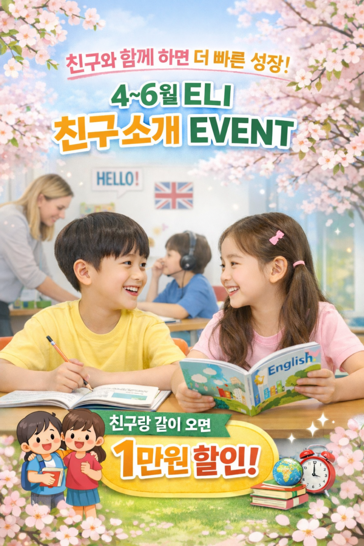 안녕하세요~ 야탑 영어학원 ELI입니다. 봄기운이 완연한 4월입니다 아이들이 새로운 환경과 친구들을 만나기 가장 좋은 시기, 지금이 바로 영어 실력을 자연스럽게 끌어올릴 수 있는 골든타임입니다 4월~6월 ELI 친구 소개 EVENT!! 혼자 시작하면 낯설고 부담될 수 있는 영어 학습, 친구와 함께라면 훨씬 빠르게 적응하고, 말하기 자신감도 더 빨리 자랍니다! 그래서 준비했습니다 재원생이 친구를 소개하면 ✔️ 소개한 재원생도! ✔️ 새로 등록하는 친구도! 첫 달 수강료 1만원 할인 혜택 제공 단순한 할인 이벤트가 아니라, ✔️ 친구와 함께 배우며 자연스럽게 speaking 환경 형성 ✔️ 수업....... <img src="https://blogthumb.pstatic.net/MjAyNjA0MDJfMTEx/MDAxNzc1MTE0NDY3MzI4.ni4lM-dPQD8xJu_lI1OEGyhnP-5vWw52qAnQE52RfiEg.op_BZ_YzvMN2KcL3oO9PCBZFGmZrN9hSqhTKUjOv3wwg.PNG/KakaoTalk_20260402_162020480.png?type=s3" />
