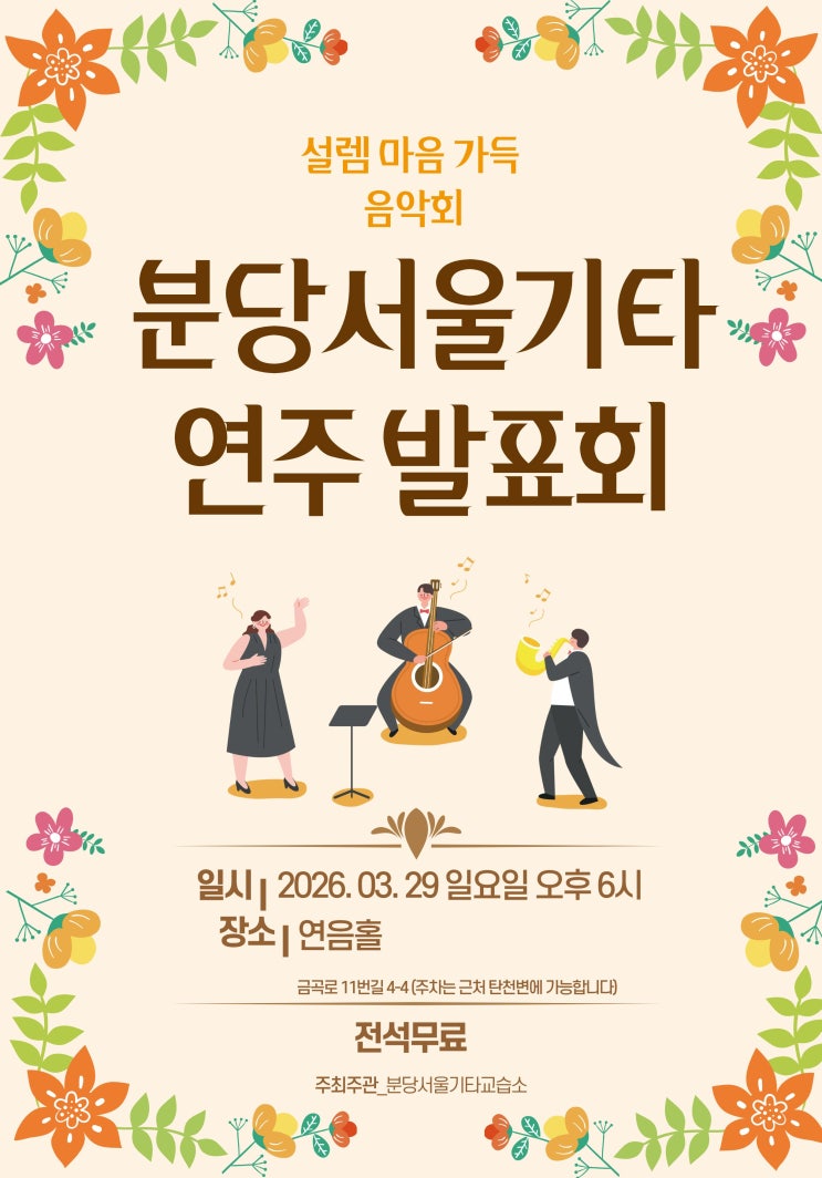 분당서울기타 교습소 1주년을 맞이하여 수강생 연주 발표회를 준비했습니다. 신청해주신분들 모두가 각자의 자리에서 열심히 준비했으니 많은 응원 부탁드립니다. 연주회는 누구나 오실 수 있고 전석 무료로 입장가능합니다. 연주회 위치 <img src="https://blogthumb.pstatic.net/MjAyNjAzMjdfNDIg/MDAxNzc0NTk2MDIyMDc2.YLyDx0qF7SiN4JsQSc3MoNBgTzfL2Mo0xt4EGDdB_Qkg.KHQX2Y244CpCOnEZclhqfc9GDHQGG5F8KtoJiIf2eJAg.JPEG/1.jpg?type=s3" />