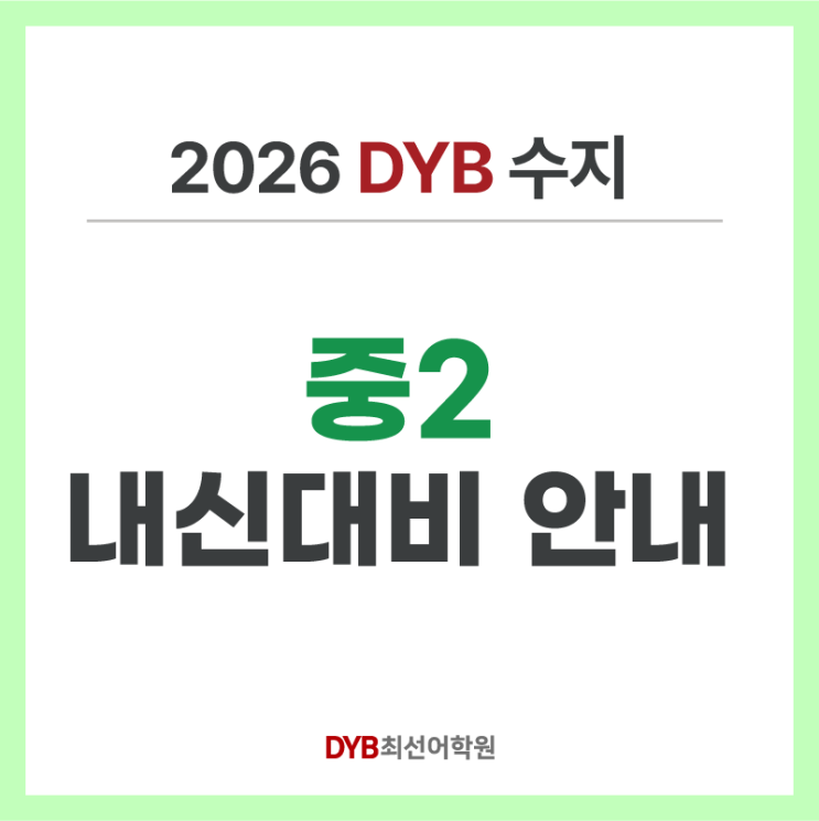 안녕하세요. DYB 최선어학원 수지캠퍼스입니다. ✨중2 1학기 중간고사 내신 대비✨ 안내드립니다. ✨내신 대비 기간 ✔️ 4/6(월) ~ 4/29(수) 내신 수업 내용 ✔️ 중학교 교과서 2개과 + 학교별 심화 문법/독해 수업 시간표 ✔️ 월, 수 [월 6-8시, 수 6-10시] ✔️ 월, 금 [8-10시,금 6-10시] ✔️ 화,목 [화, 목 7-10시] 중2 내신 학교 광교중, 문정중, 상현중, 서원중, 성복중, 성서중 소현중, 손곡중, 수원다산중, 수지중, 신봉중 연무중, 이의중, 이현중, 정평중, 한빛중, 홍천중 내신 수업 구성 탄탄한 시스템과 꼼꼼한 담임 관리로 정석적인 내신 대비를 완성합니다. ✔️ 학교별 전문 수업 ✔️ 체계적인 내신 시스....... <img src="https://blogthumb.pstatic.net/MjAyNjAzMzFfMTU5/MDAxNzc0OTQwMjIwOTIx.LpVvQ02smPKf1oYnqwPtH3YhdgnwaR1zNAhHW7feGBcg.h348071G408dqzwW2YwYlaOFvv3fNPtxUdrE4_-rIXgg.PNG/%B4%EB%C1%F6_11.png?type=s3" />