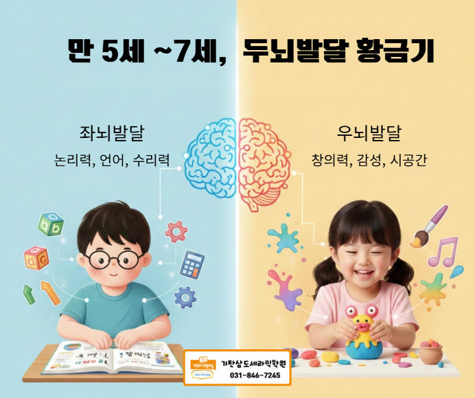 안녕하세요? 기탄신곡삼도세라믹학원입니다. 우리 아이의 인생에서 가장 중요한 시기를 꼽으라면 단연 만 5세 ~ 만7세 사이 입니다. 이 시기는 뇌 과학적으로 '두뇌 발달의 황금기'라 불리며 좌뇌와 우뇌가 폭팔적으로 연결되는 골든타임이기 때문입니다. 좌우뇌를 깨우는 두뇌발달 황금기에대해 오늘은 신곡동유치공부방, 신곡동1학년공부방 기탄신곡삼도세라믹학원에서 전략을 정리 해 드립니다! 왜 만5세~7세가 '두뇌 황금기' 일까요? 사람의 뇌는 만 6세 전후로 성인 뇌 용량의 약 90%까지 성장합니다. 단순히 지식을 집어넣는 시기가 아니라 정보를 처리하는 '뇌의 회로'를 설계하는 시기이기 때문입니....... <img src="https://blogthumb.pstatic.net/MjAyNjAyMDRfMTI1/MDAxNzcwMTM0NDY1NTcx.7aFa1m1XdnDmTI_cxJEKjOxmEZW0d4veiA-RAR9iILkg.pkamwSpnaZ6uCTHIDiPPrC9ajL54TVcA7aMjI1JmyW4g.PNG/image.png?type=s3" />