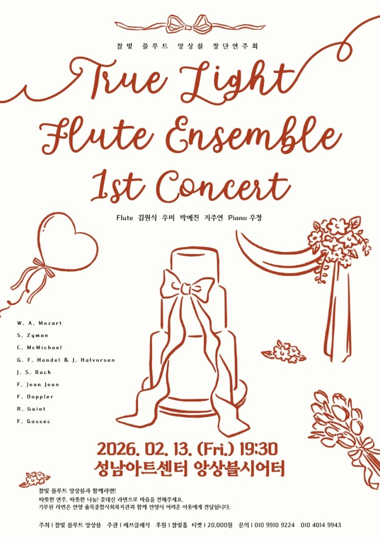 석수동 음악학원장 창단식 관람기 안녕하세요! 오늘은 석수동 음악학원장으로 몸담고 있는 일꼬로델플라우토 지휘자님과 악장님 그리고 그외 또다른 악장님 두분과 피아니스트로 결성된 참빛플루트 창단식에 다녀온 이야기를 나눠보려고 합니다. 정말 기대가 컸던 행사였고, 그만큼 설렘도 가득했답니다. 창단식 준비하시며 곡선별과 편곡들 그리고 얼마나 많은 연습을 하셨을지...듣는 내내 참 행복한 시간이었습니다. 프로그램이 이렇게 멋지게 준비되었답니다. 3분의 악장님과 지휘자님,그리고 피아니스트의 멋진 하모니의 멋진 무대는 정말 최고 였습니다. 김원식지휘자님과 지주연악장님 소개 우리 일꼬로델플라우토의 지휘자님과 악장....... <img src="https://blogthumb.pstatic.net/MjAyNjAyMTRfMTI5/MDAxNzcxMDAwOTgxNDIx.dANuNKroxCdTULvqXmGOT2Gz-w7BoqzRWAkER0sJbZog.oaFHY2wYHbatN3ACzvdoqWFx9fVg48SrekWGUDjbo2Ug.JPEG/900%A3%DF1770636362352.jpg?type=s3" />