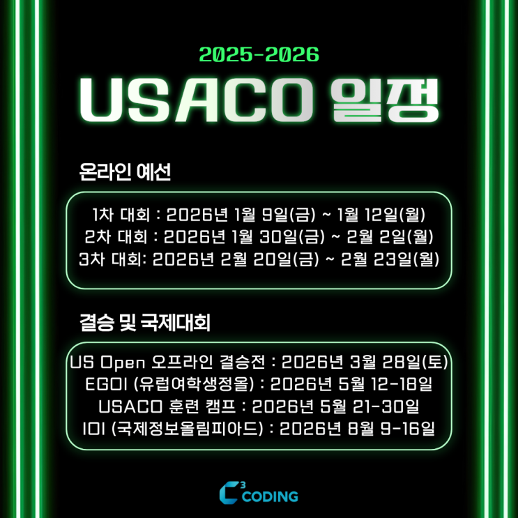 안녕하세요 사고력 중심 코딩 교육을 지향하는 씨큐브코딩 입니다. 코딩은 언제부터 시작해야 할까? 우리 자녀에게 코딩이 잘 맞을까? 학부모님들께서 항상 고민하시는 부분이시죠. 최근 코딩 교육의 흐름 단순한 문법 습득을 넘어, 문제를 이해하고 스스로 해결 방법을 찾아가는 사고력 중심 학습으로 빠르게 변화하고 있습니다. 이러한 흐름 속에서 전 세계적으로 주목받고 있는 대회가 바로 USACO(USA Computing Olympiad)입니다. USACO 란? USACO (USA Computing Olympiad), 유사코 미국정보올림피아드 USACO는 미국에서 주관하는 컴퓨터 알고리즘 경시대회로, 전 세계 초·중·고등학생들이 참여하는 국제적인 대회입니다. 단순히 코딩 문....... <img src="https://blogthumb.pstatic.net/MjAyNTEyMTlfMjM3/MDAxNzY2MTE2NjgzOTM2.edqdj9D_xnXIgHBClRdLNQvKSz7VH9WX5EnSyP482yog.4F1lAAZ9LS2VhOILJRt9ulpS7WT7WZ91fpRLbM_U2s8g.PNG/USACO.png?type=s3" />