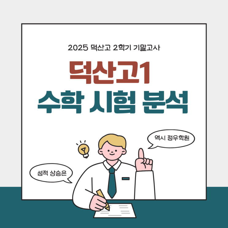 2025년 마지막 시험이 끝났습니다. 가채점 결과 정우학원 학생들이 우수한 성적을 거둔 것로 확인되었습니다. 50점이 넘는 점수가 오른 학생도 있었습니다. 자세한 성적은 성적표가 나오면 올리도록 하겠습니다. 덕산고1 수학 2학기 기말고사 총평 난이도 : 중하 이번 시험은 크게 어려운 문제 없이 평이하게 출제되었습니다. 이번년도 4번의 시험 중 가장 쉽게 출제 되었습니다. 특히, 교과서 반영 비율이 높아서 교과서를 열심히 공부한 학생이라면 좋은 성적을 거두었을 것입니다. 다만, 시험이 쉬웠던 만큼 1등급 커트라인도 높을 것으로 예상됩니다. 정우학원 학생들이 좋은 성적을 거둘 수 있었던 비결은 무엇일까요? 바로 정우학원 수학 모....... <img src="https://blogthumb.pstatic.net/MjAyNTEyMTBfODUg/MDAxNzY1MzMwMjcxNzQ2.MEqIhLYdSpIRr3PZcLZxxEfCBBF1C0TCyDT8LM9AfHsg.VhtzNOusgsYR9VrtU-1NAInor_8nShjvkHSAqycsm7Ig.PNG/%C1%A6%B8%F1%C0%BB_%C0%D4%B7%C2%C7%D8%C1%D6%BC%BC%BF%E4._%281%29.png?type=s3" />