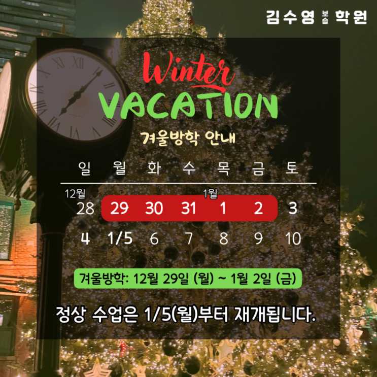 김수영보습학원입니다 12월과 1월이 각각 5주인 관계로, 12/28(월) ~ 1/02(금) 결석자가 많아 해당 주는 방학으로 운영하게 되었습니다. 방학 기간: 12/28(월) ~ 1/02(금) 정상 수업 재개: 1/05(월) 일정 참고 부탁드립니다. 연말 잘 마무리 하시고, 새해 더욱 탄탄한 수업으로 찾아뵙겠습니다. <img src="https://blogthumb.pstatic.net/MjAyNTEyMTJfODAg/MDAxNzY1NTI5ODM5MzE5.YIatJ6m-eNIz6Fxccfp8UqgS7BAOHLiEY16-qJwI1Vsg.OvwtpOxvT-dE6s0y44ZdDVTP0dKG5WHKUML1bJrfp6sg.PNG/900%A3%DF1765529771694.png?type=s3" />