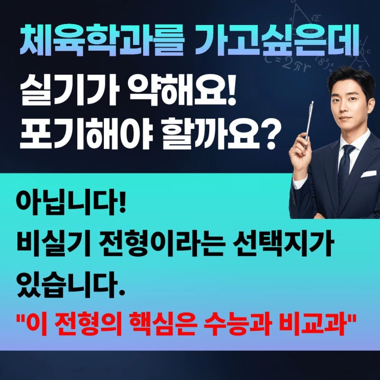 안녕하세요, 더킹입시학원입니다. 체육학과 입시를 준비하는 학생들과 상담하다 보면 가장 많이 듣는 질문이 있습니다. "실기만 잘하면 붙을 수 있나요?" 결론부터 말씀드리면, 아닙니다. 체육학과 입시는 실기만의 싸움이 아닙니다. 내신, 수능, 실기라는 세 가지 축이 동시에 작동하는 정교한 구조입니다. 그리고 이 구조를 정확히 이해하려면 막연한 기대보다 전형표에 제시된 숫자가 무엇을 의미하는지 읽을 수 있어야 합니다. 오늘은 더킹입시학원에서 체대입시의 핵심 요소를 숫자로 풀어드리겠습니다. 체대입시의 3대 요소를 숫자로 이해하기 첫번째! 실기 – '결정타'라는 말의 진짜 의미 더킹입시학원에서는 실기를....... <img src="https://blogthumb.pstatic.net/MjAyNTEyMTZfMTIg/MDAxNzY1ODQ2OTI0OTc2.O47V9Ina7KFolICXE77AmtwIvalrkvXJN4tKkBtGFWcg.avBhP1SfPvxUwS9Z-ycKGlgpsyv3poHCv1lul54wBkcg.JPEG/3.jpg?type=s3" />