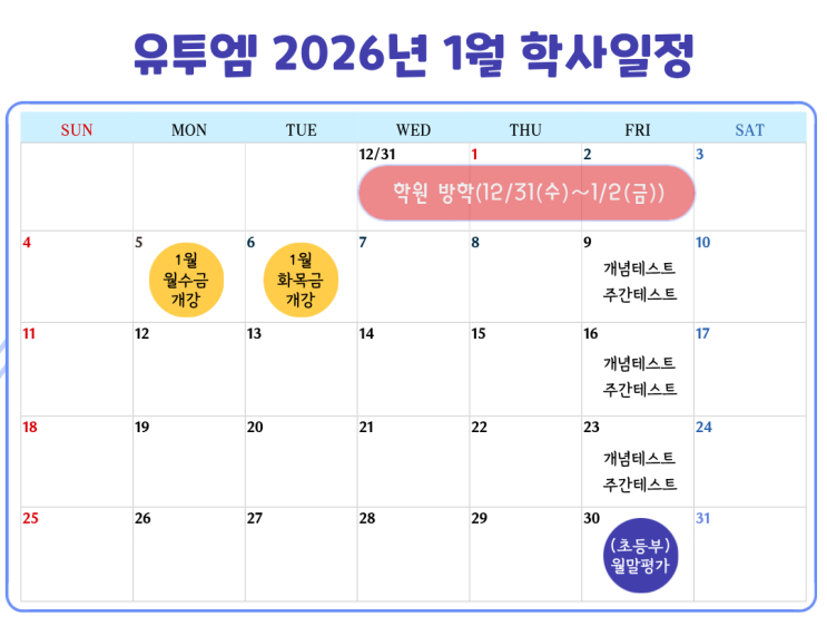 안녕하세요. 유투엠수학 옥길캠퍼스 2026년 1월 수강 안내문 입니다. ★ 1월 재원생 등록 안내문 ★ 1. 개강일 월수금반 : 1/5(월) 화목금반 : 1/6(화) 2. 월말 평가(초중등 공통) 1/30(금) 1월 한달 수업 내용을 평가합니다. (결석 시 미리 학원으로 연락주세요.) 3. (중등부) 내신대비 12/19(금) 옥길중학교 1,2학년은 마지막으로 2025년 학교별 지필평가가 종료됩니다. 학교별 지필평가 문항분석은 블로그와 맘카페에 업로드 되고 있으니 학부모님의 많은 관심 부탁드립니다. 5. 결석 보강 안내 개인 사정으로 인한 결석(캠핑, 여행 등)은 보강 없이 과제로 대체됩니다. 그 외 결석 보강은 월 2회로 휫수를 제한하며, 횟수를 초과하는 결석은....... <img src="https://blogthumb.pstatic.net/MjAyNTEyMTdfMjQx/MDAxNzY1OTYzOTY0NDIw.HiEvLzHDMKNZ1KfC20pfpGIx8-yI9TNo408CMIgr1qMg.A9t_mO-jKc2MLlzHz7mHDLtfKw6FugXJROLUpWj_wYEg.PNG/%BF%F9%BA%B0_%C0%CF%C1%A4%C7%A5_%281%29.png?type=s3" />