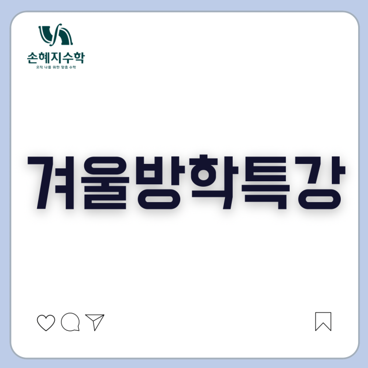 안녕하세요 손혜지수학 입니다. 2026년 1월 12일 개강하는 겨울방학특강 안내입니다. 모든 특강 결석(여행, 질병 및 모든 사유 포함) 시 보강수업이 없습니다. 이 점 확인하신 후 12/31(수)까지 신청 부탁드립니다. (개별특강은 12/31 전에 마감될 수 있습니다.) 손혜지수학의 모든 특강은 듣기만 하는 것이 아니라, 교재를 꼼꼼히 완성하는 것을 목표로 합니다. 1) 공통수학1 유형 특강 강사: 손혜지 일시: 1/12부터 1/21까지, (1/28~1/30 학원 방학), 2/2부터 2/11까지 (1월 12,14,19,21일, 2월 2,4,9,11일) 월수 1:00~2:30 / 총8회 교재: 라이트쎈 공통수학1 2) 공통수학2 개념 특강 강사: 이준혁 일시: 1/12~1/26 (1월 12,14,16,19,21,23,26)....... <img src="https://blogthumb.pstatic.net/MjAyNTEyMThfMTY3/MDAxNzY2MDU5NjgyMDU4.7uCtehX3tHkjHjynQXaty09a8G5yXUkms3qKBNq94JQg.Jb9U9gVqWG7M5S_Ya70LUQ8fMdYzIvgbycR6K1TKwd8g.PNG/Black_Developers_News_Page_Advertising_Content_Sharing_Instagram_Post_-_5.PNG?type=s3" />