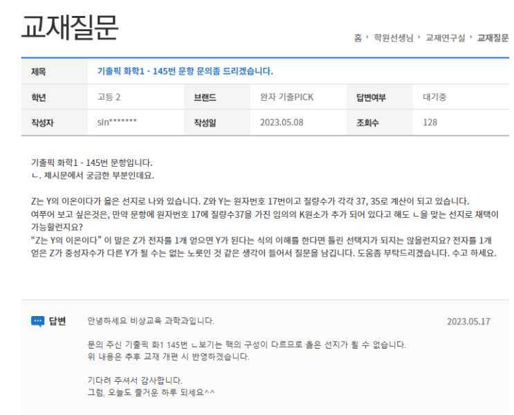 기출픽 화학1 오류 문항