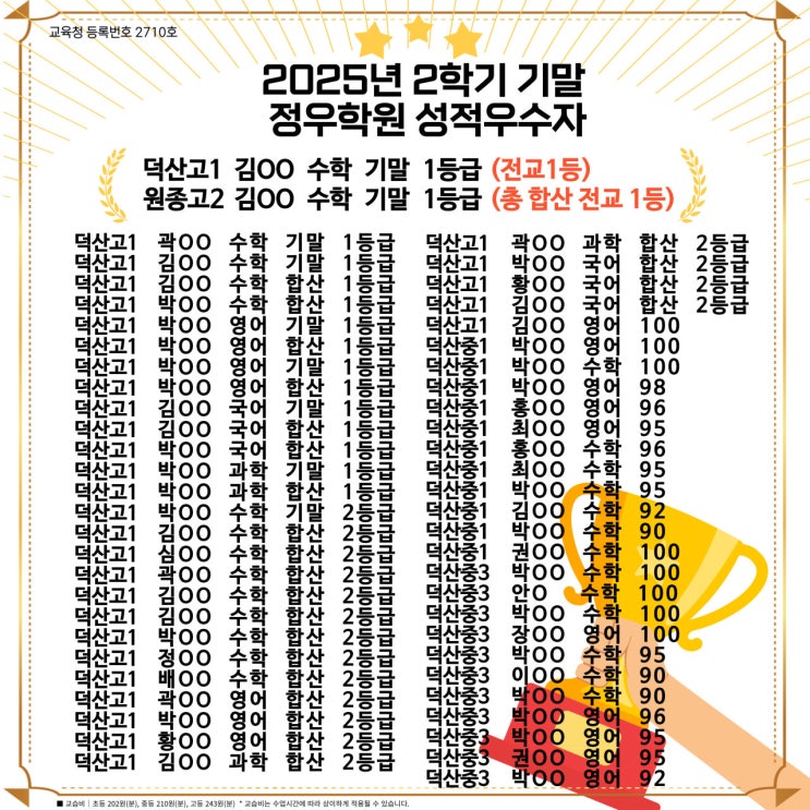 2025년은 정우학원에게 있어서 정말 특별한 한 해였습니다. 지난 2023년~24년 동안 끊임없이 고민하고 연구하고 개발해온 교육 커리큘럼이 빛을 발하기 시작한 해이기 때문입니다. 2022년 고등부를 제대로 시작하기 위해서 정말 많은 준비 준비했습니다. 학원 커리큘럼을 열심히 따라오면 내신에서 좋은 성적을 거둘 수 있는 것 뿐만 아니라 수능까지 대비할 수 있는 진짜 교육을 하고 싶었습니다. 그래서 과목별 수 많은 스타강사의 수업을 듣고 서울에 있는 유명 학원들의 커리큘럼과 교육방식을 보고 배웠습니다. 그리고 이를 오정동 환경에 맞게 적용하기 위해 끊임없이 연구하고 시도했습니다. 그러나 오정동의 학생과 서울의 학생들은 달랐....... <img src="https://blogthumb.pstatic.net/MjAyNjAxMTVfMjk1/MDAxNzY4NDU0NzkyNzA1.5_ro6zxF6jWUfEtwcL0p_kn6mLfPpF9vscb4t5mzcfIg.iuQewmzwQfWKgAue7oeZ2c5QbIOmBR7_3ig8jDpbD-Qg.JPEG/%B4%D9%BF%EE%B7%CE%B5%E5.jpeg?type=s3" />