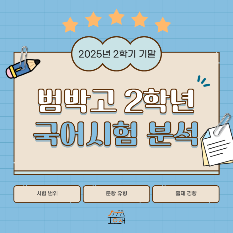 안녕하세요, 부천 수오재 국어학원입니다! 시험이 끝나면 점수 확인만큼이나 중요한 것이 바로 시험에 대한 철저한 복기 겠죠? 특히 우리 학교의 출제 경향을 파악해두면 어떤 것을 중점적으로 공부하고 준비하여야 하는지 알 수 있습니다. 오늘은 범박고등학교 2학년 학생들의 2025년 2학기 기말고사 국어시험 분석 내용을 요약해드리겠습니다. ' 범위 ' 부교재 : 빠작 수능국어 비문학 독서 (인문예술, 사회문화, 과학기술 각 6~12) ' 문항 유형 ' 객관식 24문항 100점 ' 총평 ' 이번 시험은 고1~2 모의고사 기출 문제로 이루어진 <빠작 수능국어 비문학 독서>에서 모든 시험문제가 나왔습니다. 전체적으....... <img src="https://blogthumb.pstatic.net/MjAyNjAxMTVfODIg/MDAxNzY4NDY2NzE4MjQw.DA5iFDL-2GODIDBZY5rfC4h3Ir910crgW7YEpxkebGAg.Fv-9jSKroQRq_P7bPP310dF8Df5HbtfpdG4rdxlAGvsg.PNG/%C1%A6%B8%F1%C0%BB_%C0%D4%B7%C2%C7%D8%C1%D6%BC%BC%BF%E4._%283%29.png?type=s3" />