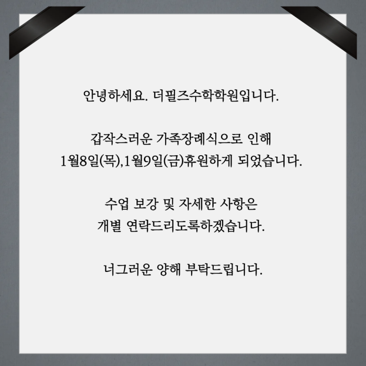 안녕하세요. 더필즈수학학원입니다. 갑작스러운 가족장례식으로 인해 1월8일(목),1월9일(금) 휴원하게 되었습니다. 수업 보강 및 자세한 사항은 개별 연락드리도록하겠습니다. 너그러운 양해 부탁드립니다. <img src="https://blogthumb.pstatic.net/MjAyNjAxMDdfMTcy/MDAxNzY3Nzc5NzY1NDUw.xevmy2PpGOwOgGKzx6FMZk4hnCnbfjHx0uBavR5COEcg.j49WFJB94Kz7er0LX7hdcpj8rksS7fowGoceFpg92v8g.PNG/%C1%A6%B8%F1%C0%BB_%C0%D4%B7%C2%C7%D8%C1%D6%BC%BC%BF%E4._%283%29.png?type=s3" />