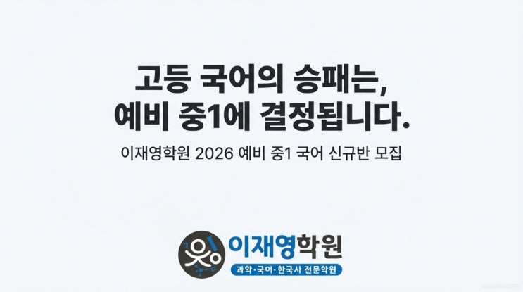 -예비중1 국어- 고등국어의 승부처, 중학교 1학년에 결정됩니다 : 이재영학원 신규반 개설 안내 안녕하세요. 이재영과학국어한국사학원입니다. 초등학교 졸업을 앞두고 중학교 입학을 기다리는 예비중1 시기, 학부모님들의 고민은 깊어집니다. "중등 국어는 내신만 잘 나오면 되는 거 아닌가요?" 혹은 "벌써 고등국어를 준비해야 하나요?"라는 질문을 자주 받습니다. 하지만 현장에서 수많은 고등학생을 입시의 정점까지 지도해온 전문가로서 단언컨대, 수능 국어와 고등 내신의 성패는 '중학교 1학년 때 어떤 사고의 틀을 형성했느냐'에서 갈립니다. 단순히 문제 풀이 스킬을 익히는 프랜차이즈 학원 스타일로는....... <img src="https://blogthumb.pstatic.net/MjAyNjAxMTFfMjIx/MDAxNzY4MTEwNTI2MDIx.XbGiZ6X6FfY3UoeVUbOC9aYeLb_sK34lh8x8sBWzCt8g.hya7Iz5xTowNYMYnJfB5Pg9t6Nj-3e74v0MGDPQs45Eg.JPEG/random%A3%DF43ED9633%A3%AD9A5C%A3%AD49EF%A3%AD8AB7%A3%AD8BD1125C50D6.jpeg?type=s3" />