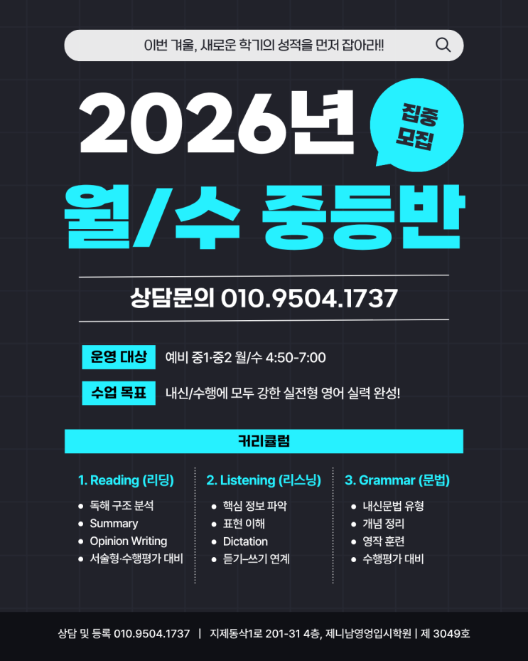 안녕하세요. 에이닷 영어학원입니다. 겨울방학이 시작되면 마음은 여유로운데, 막상 지나고 나면 “한 게 없네…”라는 말이 나와요. 계획 없이 보내는 방학은 순식간에 흘러갑니다. 특히 영어는 쉬는 순간 바로 감이 떨어지는 과목이에요. 그래서 에이닷은 방학부터 다르게 설계합니다. 개학과 동시에 일정은 빠르게 흘러가기 시작해요. 3월엔 적응, 수행평가, 시험 범위가 한꺼번에 나옵니다. 4월엔 중간고사 대비와 수행평가가 몰아쳐요. 5월엔 중간고사 직후 또다시 수행과 기말 대비가 시작됩니다. 기본 실력을 쌓을 여유는 점점 사라져요. 그래서 기초는 반드시 겨울방학에 완성해야 합니다. ⚡ 에이닷 영어학원은 연간 흐....... <img src="https://blogthumb.pstatic.net/MjAyNTEyMzBfMTU3/MDAxNzY3MDU3MTU3OTY1.wzs_lb4cI48tT69mCU2LBQ9RkUeO6J_unwt64vkgfq0g.w8GcKm0E6vuYKxz3SV2rFesJshOYNFpooEtFPrSPM7Mg.PNG/01.png?type=s3" />