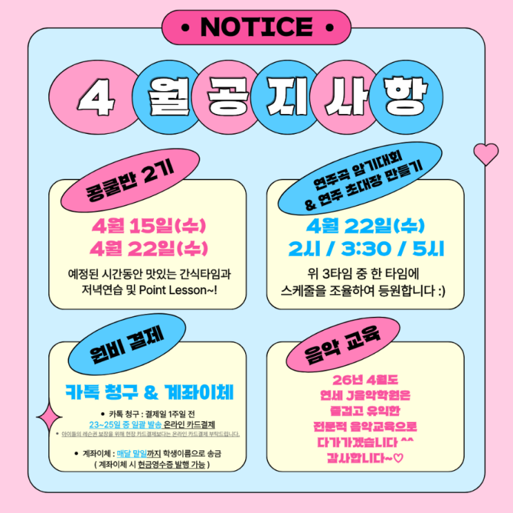 안녕하세요 연세 J음악학원입니다 ☺️ 완연한 봄이 다가오는 요즘입니다~ 점점 따뜻해지는 온기로 행복 가득한 4월을 맞이하시길 바랍니다 4월은 열심히 달려오는 콩쿨반 2기반을 위해 월 2회 정해진 시간 맛있는 간식Time과~~ 저녁 연습 및 Point Lesson이 있을 예정입니다. 4월은 5주인 관계로 4월 마지막 주 수요일은 4월 22일이 됩니다. ✉️♥️ 4월 22일(수)은 5월에 있을 연주곡 암보대회 + 직접 아이들이 초대장을 만들어 보는 시간을 갖습니다. 2시 / 3:30 / 5시 위 3타임 중 1타임에 스케줄 조정하여 참석합니다:) 연주회를 준비하고, 참가한다는 의미. 무대위에서 연주하는 것 그 자체도 의미가 있지만, 연주실력....... <img src="https://blogthumb.pstatic.net/MjAyNjA0MDFfMjA3/MDAxNzc1MDIxOTAyMTQy.QgUxrlHycvLY7np-5budr9fGvVpUdad0hQuudV7mhFYg.U1kgDGOyGCct9rdCfo45N-f6_Wq2SainAESidvsJP14g.PNG/900%A3%DF1774974257291.png?type=s3" />