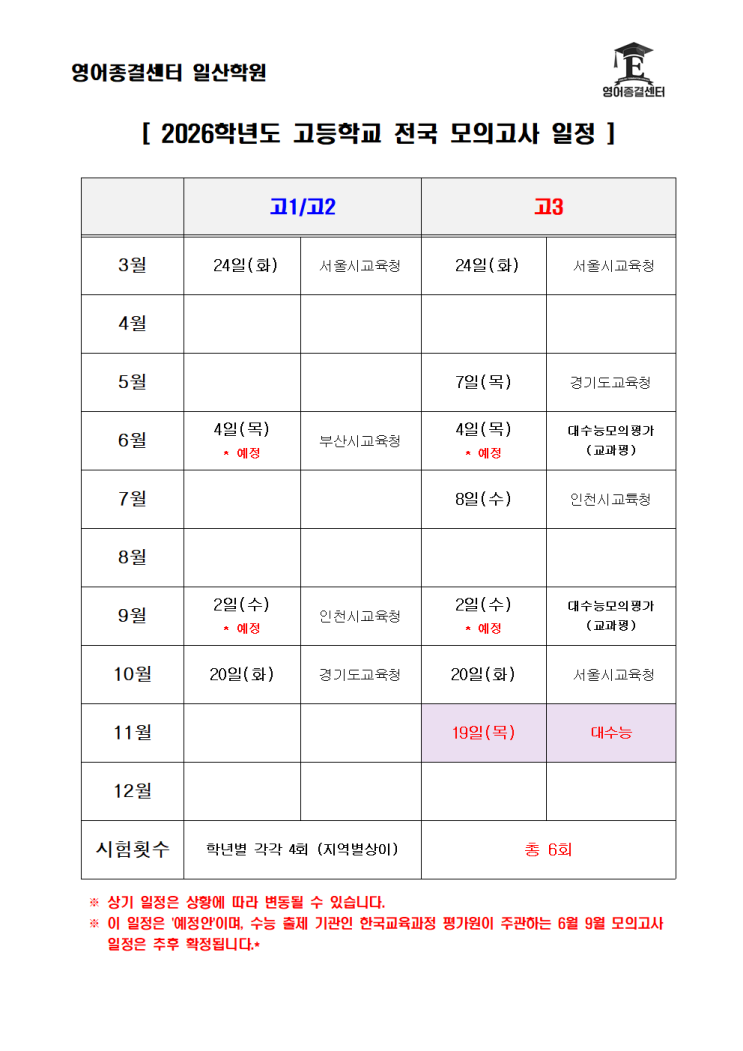 [일산동 영어학원] 2026 고등 모의고사&대수능 일정