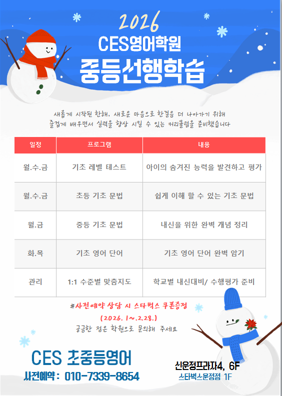 영어"NE9월 호" 중등선행학습 프로그램 2026년 겨울방학이 시작되었습니다, 새학기부터 기초 문법부터 시작하여 영어의 기본 단계를 즐겁게 배우며 실력을 향상 시킬 수 있는 커리큘럼을 진행합니다.ru CES 학습 프로그램으로 영어 공부를 시작한 친구들이 새학기에도 우수한 성적을 올릴수 있는 선행학습과정으로 기초부터 단계적 문법까지 지금 바로 시작합니다. 학교별 내신대비와 수행평가도 완벽히 준비하도록 시작해보아요. 중요한건 개인별 수준별 지도를 합니다. 우리애가 아무것도 몰라요 라는 말씀 이제 기초를 배워야 해요? 그래도 괜찮습니다. 파닉스 부터 차근 차근 영어의 자신을 갖게 도와드립니다. Right now~ 스타벅....... <img src="https://blogthumb.pstatic.net/MjAyNjAxMDdfNTcg/MDAxNzY3NzYzNDAyODEz.E5UB5jkwWns0PG4-LAtqEKiFluyBxVUbrEVPskaj9Gcg.9RCOtVUsGWkRExSpUC7ejrEE8GBLS7wh5bH-1xR_dK8g.PNG/345.png?type=s3" />
