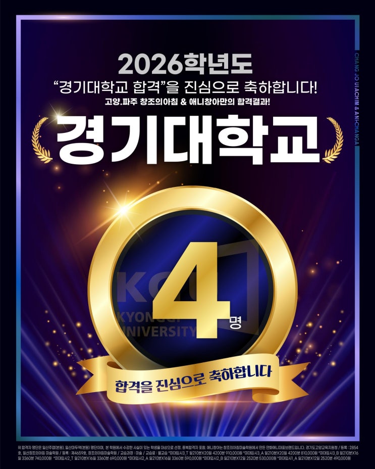 안녕하세요, 웹툰만화학원 애니창아 일산본원(주엽,마두역)입니다. 새해 첫날 듣는 노래는 한 해가 어떤식으로 흘러갈지 영향을 줄수도 있다는 소문 아세요? 소문일 뿐이지만 첫 곡을 어떤걸 들을지 결정하는것도 새로운 한 해를 여는 소소한 재미라고 생각합니다~! 여러분은 어떤 노래를 들으셨나요? 늘 우리 애니창아 학생들을 생각하며 밤낮없이 고민하는 애니창아가 준비한 노래는 합격의 노래 입니다! 오늘도 어김없이 찾아온 완벽한 합격 소식! 축하합니다! 경기대학교 애니메이션학과 수시 4명 합격 쾌거! 웹툰&만화 분야의 미래를 이끌어갈 인재를 양성하는 경기대학교 애니메이션학과 수시 전형에서 저희 일산만....... <img src="https://blogthumb.pstatic.net/MjAyNTEyMzBfNzcg/MDAxNzY3MDc5NTYzODU1.6P9ZhKt3SyRDkDnR9eilkr3PsHpO_5vdAWcIQMFci74g.tc29RI3KPYT2BUbDZB4lP3CqAbOu7FSwruC9pzMh1EQg.JPEG/%C0%CF%BB%EA%B8%B8%C8%AD%C7%D0%BF%F8_%BE%D6%B4%CF%C3%A2%BE%C6_%B0%E6%B1%E2%B4%EB01.jpg?type=s3" />
