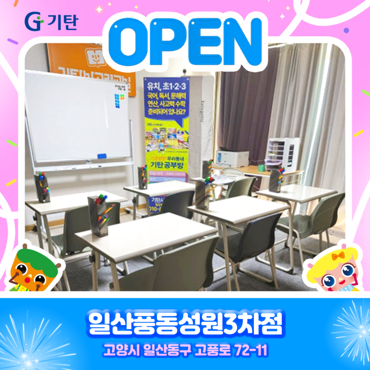 안녕하세요, 아이들에게 '힘이 되는 진짜 공부'를 지향하는 기탄사고력교실입니다. 어느덧 4월의 완연한 봄기운과 함께 새 학기가 본격적으로 시작한 지 벌써 몇 주가 지났습니다. 아이들은 저마다 유치원 혹은 학교생활에 적응하며 새로운 배움의 즐거움을 알아가고 있을 텐데요. 현재, 시기에 맞춰 고양시 일산동구 학부모님들께 아주 반가운 소식을 전해드립니다. 바로 풍동 공부방의 새로운 강자로 떠오를 기탄사고력교실 일산풍동 성원3차점이 문을 열었습니다! 그렇다면, 풍동 공부방 일산풍동성원3차점은 어떤 공간이고 또 이 곳에서 무엇을 배우는 지 한 번 같이 알아볼까요? ✨ 생각을 시각화하는 마법, 화이트보드가 있....... <img src="https://blogthumb.pstatic.net/MjAyNjA0MDZfMjY3/MDAxNzc1NDUxNjgxMjIz.34QBSG3Us1xRnO59-KXPxHYa39bzW6Xn6NtDzcYT5QAg.5WSGtdg7SwoCQgbMzA16X-b3fMmkTNPpGUs3Ouja5t8g.PNG/0402_%C0%CF%BB%EA%C7%B3%B5%BF%BC%BA%BF%F83%C2%F7%C1%A1_%284%29.png?type=s3" />