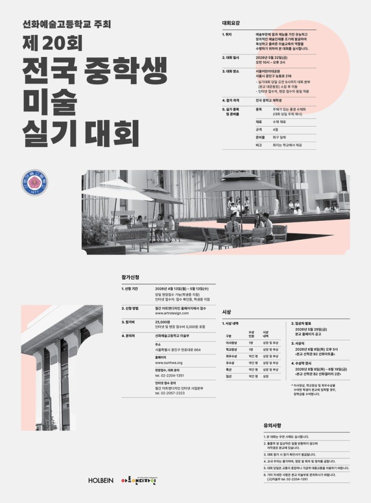 안녕하세요~ 후곡 C&C 미술학원입니다^^ 지난 고양예고 실기대회 소식에 이어 오늘은 선화예고 실기대회 정보를 안내드립니다^^ 대회 개요 *일시 : 2026년 5월 22일 (금) 오전 10시 ~ 오후 3시 *장소 : 서울어린이대공원 실기 유형 *종목 : 주제가 있는 풍경 수채화 (당일 현장 주제 제시) *재료 : 수채화 *규격 : 4절 *준비물 : 화구 일체 개인 준비 *화지 : 학교에서 제공 참가 안내 *신청 기간 : 2026년 4월 13일(월) ~ 5월 13일(수) *접수 방법 : 아트앤디자인 홈페이지 접수 *참가비 : 25,000원 시상 안내 대상 / 학교장상 / 최우수상 우수상 / 특선 / 입선 발표 및 전시 *입상자 발표 : 2026년 5월 29일(금) ....... <img src="https://blogthumb.pstatic.net/MjAyNjA0MDZfNzEg/MDAxNzc1NDUyODUxNjU4.jQd9C_S2rF2XCVsc8LNCQtwRSgpsidKc0m1LV9zheHQg.VZFbdnHCxDcp9cEXDpVaJzff10qQxG0wuKROfGlOQwIg.JPEG/j_bgbUd018svchl951i46wc0p_t58rj2.jpg?type=s3" />