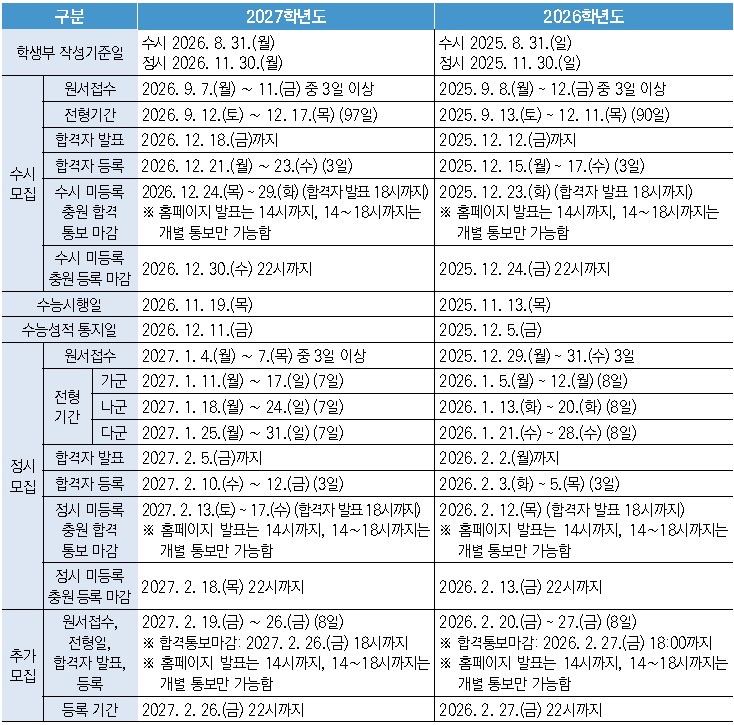 2027학년도(2026년 수험생 기준) 대입 전형의 주요 사항에 대해서 간략하게 정리했습니다. ☆ 대입 전형 일정 수시 모집 및 정시 모집의 일정은 전년도와 비슷 정시 미등록 충원 등록 마감 일시 - 2027년 2월 18일 22시까지 추가 모집에 지원할 학생은 정시 미등록 충원 등록 마감일 16시까지 정시 등록 포기 ☆ 전체 모집 인원 증가 ☆ 수시 모집 인원 증가, 정시 모집 인원 감소 ☆ 권역별 모집인원 비율 ☆ 수시모집은 학생부위주, 정시모집은 수능위주 ☆ 사회통합전형 ☆ 지역인재 특별전형 모집인원 의대 모집 인원의 변화때문에 지역인재 특별전형의 모집인원이 증가 ☆ 학교폭력 조치사항 대입 전형 반영 #2027입시정보 #일산과학 #고양....... <img src="https://blogthumb.pstatic.net/MjAyNjAxMTFfNzEg/MDAxNzY4MTMxOTE4NzYx.Q1lg8fvwaiA1hHFBRkPUtnGTnxDhySzfyBgNnKlPDxog.n_XAX9068jlp410sZ6g4EnGnInqXQdVW21byUQ9mTK8g.PNG/image.png?type=s3" />