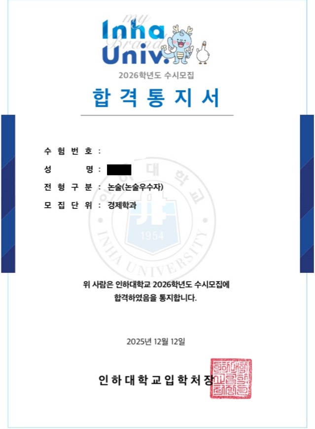 일산논술학원,일산인문논술★2026학년도 수시 논술전형 인하대학교 경제학과 최초 합격 사례★후곡논술학원,후곡인문논술,주엽인문논술,운정인문논술,백마인문논술,김포인문논술,화정인문논술