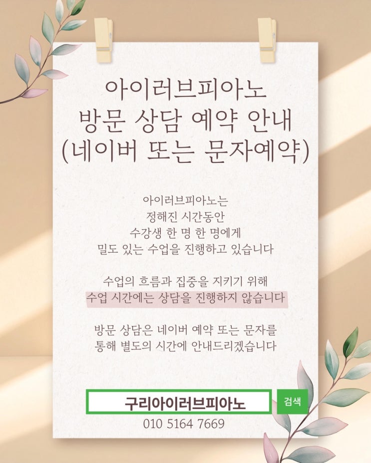아이러브피아노는 정해진 시간 안에 수강생 한 명 한 명에게 집중하는 레슨을 진행하고 있습니다. 한 곡이 완성되기까지의 과정, 아이의 손 모양 하나, 소리의 깊이 하나까지 놓치지 않기 위해 수업 시간은 오롯이 레슨에만 집중합니다 그래서 수업 중에는 상담을 진행하지 않으며, 방문 상담은 네이버 또는 문자 예약을 통해 별도의 시간에 안내드리고 있습니다. 수업의 흐름과 연주의 완성도를 지키기 위한 아이러브피아노의 작은 원칙입니다. 상담을 원하시는 분들께서는 “구리아이러브피아노” 검색 후 편한 시간에 예약해 주세요 문자예약은 010 5164 7669 학부모님과 수강생분들의 따뜻한 협조에 감사드립니다 아이러브피....... <img src="https://blogthumb.pstatic.net/MjAyNjAyMThfNDAg/MDAxNzcxMzgyMDk5MzE0.jfu25Y8gephUhdqx5OjbU48ctgN3a4bbMvbedC2LlEcg.HQpqBmlwuplh2Y7D398FA0Q9UjZlmByJ1tCQvJx02w8g.JPEG/%C1%A6%B8%F1%C0%BB%A3%AD%C0%D4%B7%C2%C7%D8%C1%D6%BC%BC%BF%E4%A3%DF%A3%AD001_%A3%AD_2026%A3%AD02%A3%AD17T161015.324.jpg?type=s3" />