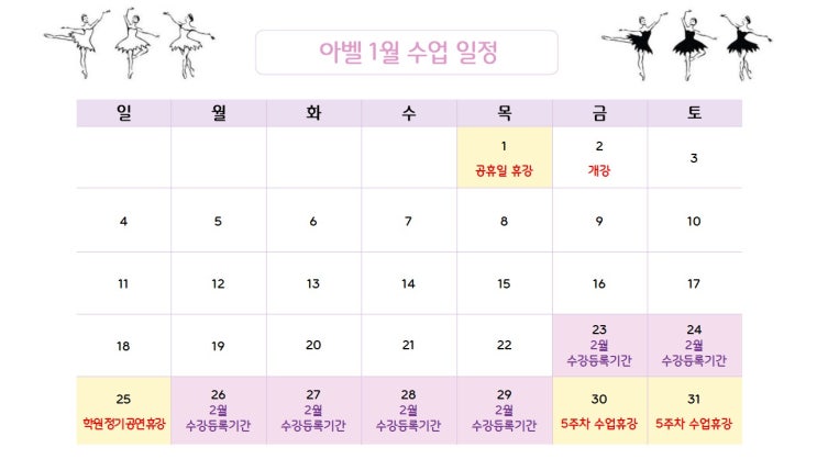 ♡ 안녕하세요 ♡ #아벨무용학원 입니다. (교육청 등록번호: 하남 제144 호) 25년 마지막 12월이 지나가고 있습니다~ 올 한해는 어떤 한해 보내셨나요? 다가오는 26년에도 건강하고 또 웃음 가득한 한 해가 되시길 바라며 오늘 26년 1월 일정과 시간표를 안내해드립니다 1월 일정표 개강 1월 2일 금요일 종강 1월 29일 목요일 1월 1일 (목) 공휴일 휴강 1월 25일 (일) 정기공연 휴강 1월 30일-31일 (금&토) 5주차 휴강 ✅ 25일(일요일) 정기공연으로 모든 수업이 진행되지 않습니다. 1월 시간표 색으로 표기된 수업들이 오픈되어 진행중인 수업이며, 모집중으로 적힌 수업은 아직 미오픈....... <img src="https://blogthumb.pstatic.net/MjAyNTEyMjNfMjcy/MDAxNzY2NDg5NTEzNzcw.srOPmLYrxCUB2zEJmSbOZxNbOgonXNHEQ7ACzaLFVf0g.vJdBwl7CxV3YMtpDfJwWJHO5KVSw2_plpT2wOAvWhBMg.JPEG/26%B3%E2_1%BF%F9_%C0%CF%C1%A4%C7%A5.jpg?type=s3" />